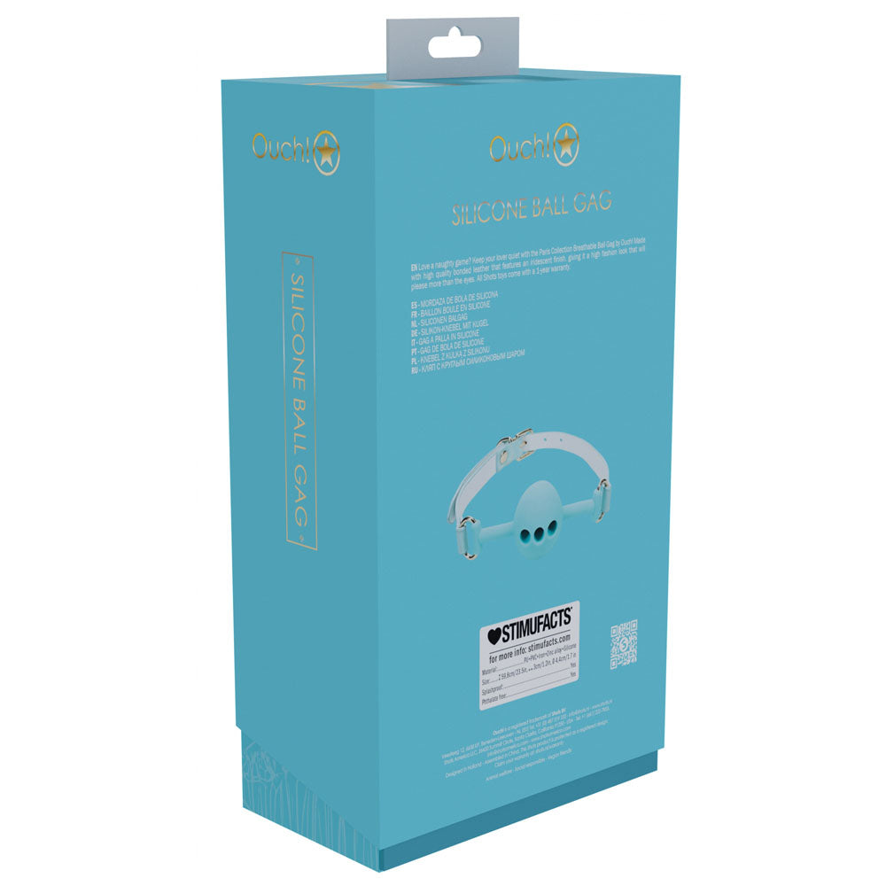 You love a naughty game? Keep you lover quiet with the Paris Collection Breathable Ball Gag by Ouch!. This gag has quality bonded leather adjustable straps for a one size fits all, and features an iridescent finish on its hardware, giving it a high fashion look that is sure to please more than the eye. Use this toy on its own, or in combination with other Ouch! products. All Shots toys come with a 1-year warranty. - Product dimensions: 60 cm x 3 cm - Product diameter: 4 cm - Materials: Silicone + Bonded Leather + Metal